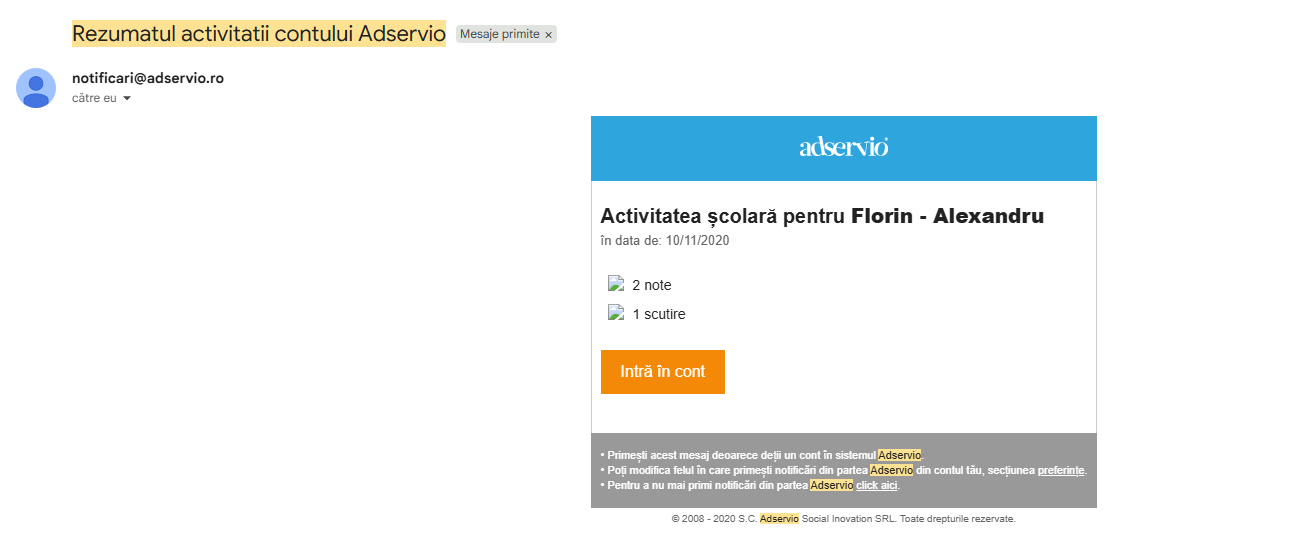 Tot ce se întâmplă în contul elevului și al părintelui pe parcursul unei zile de școală (note, absențe, activitate școlară etc.) se regăsește într-un rezumat care este trimis părinților prin e-mail. Acest rezumat se trimite la o oră stabilită împreună cu conducerea școlii, în funcție de programul școlar al fiecărei unități de învățământ.