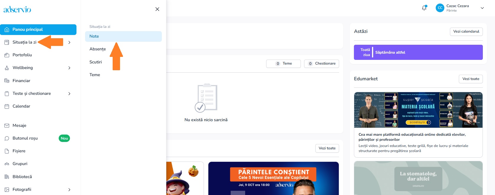 1. Din meniul principal selectează modulul Situația la zi, iar apoi secțiunea Note;