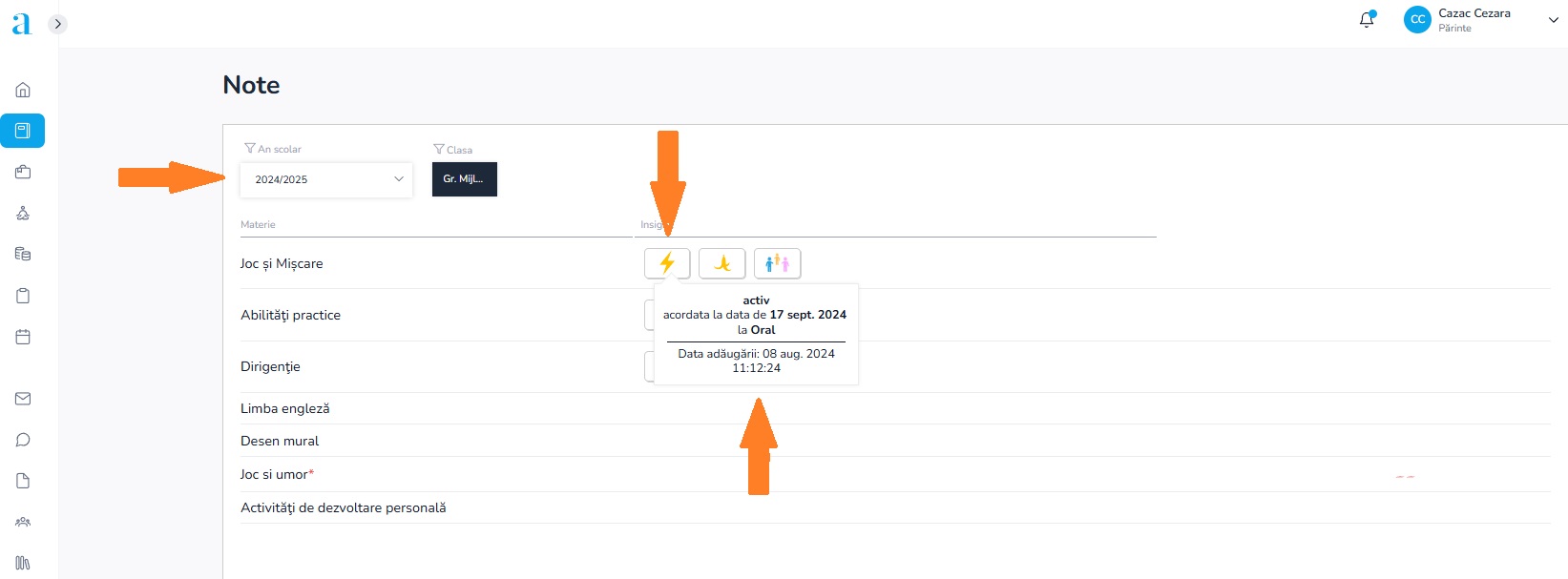 2. Apăsând pe o insignă, se va afișa semnificația acesteia și data la care a fost înregistrată;