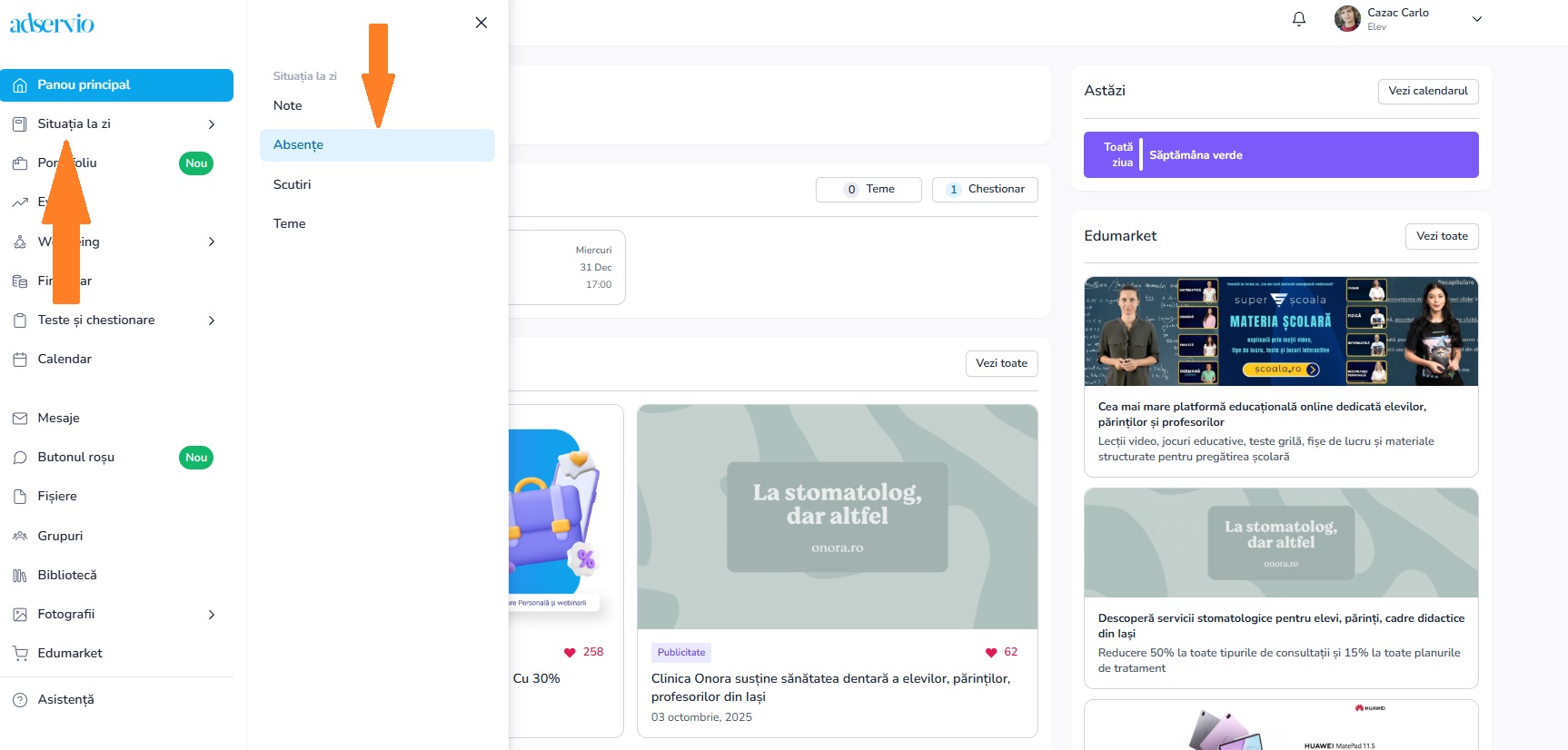 1. Din meniul principal, selectează modulul Situația la zi, secțiunea Absențe;