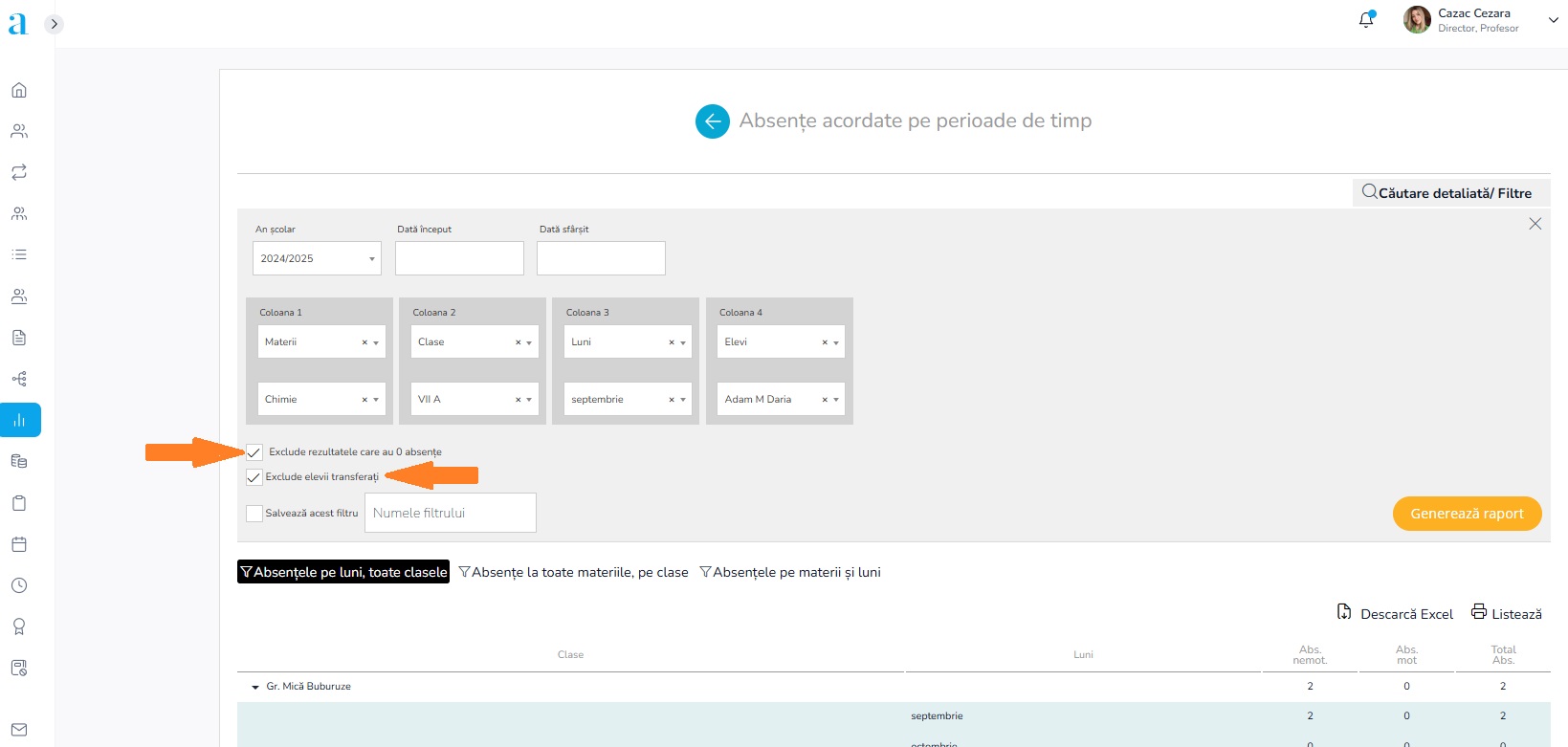 3. Raportul generat poate exclude valorile 0 prin bifarea opțiunii Exclude rezultatele care au 0 absențe și de asemenea filtrul aplicat poate fi salvat sub o anumită denumire pentru a putea fi reutilizat prin accesarea link-ului regăsit în fața tabelului generat.