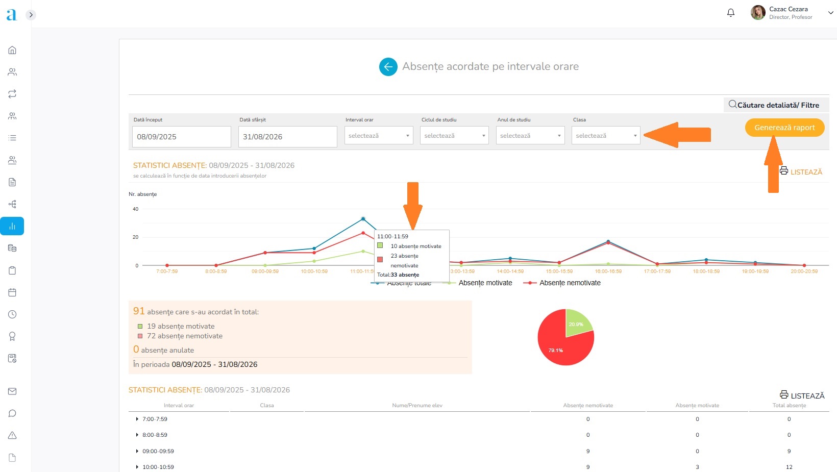 - Graficul se va genera în baza filtrelor aplicate și se va regăsi în partea de sus a paginii. Acesta va prezenta vizual punctele de creștere a numărului de absențe înregistrat (nemotivate, motivate, totale) pentru fiecare interval orar.