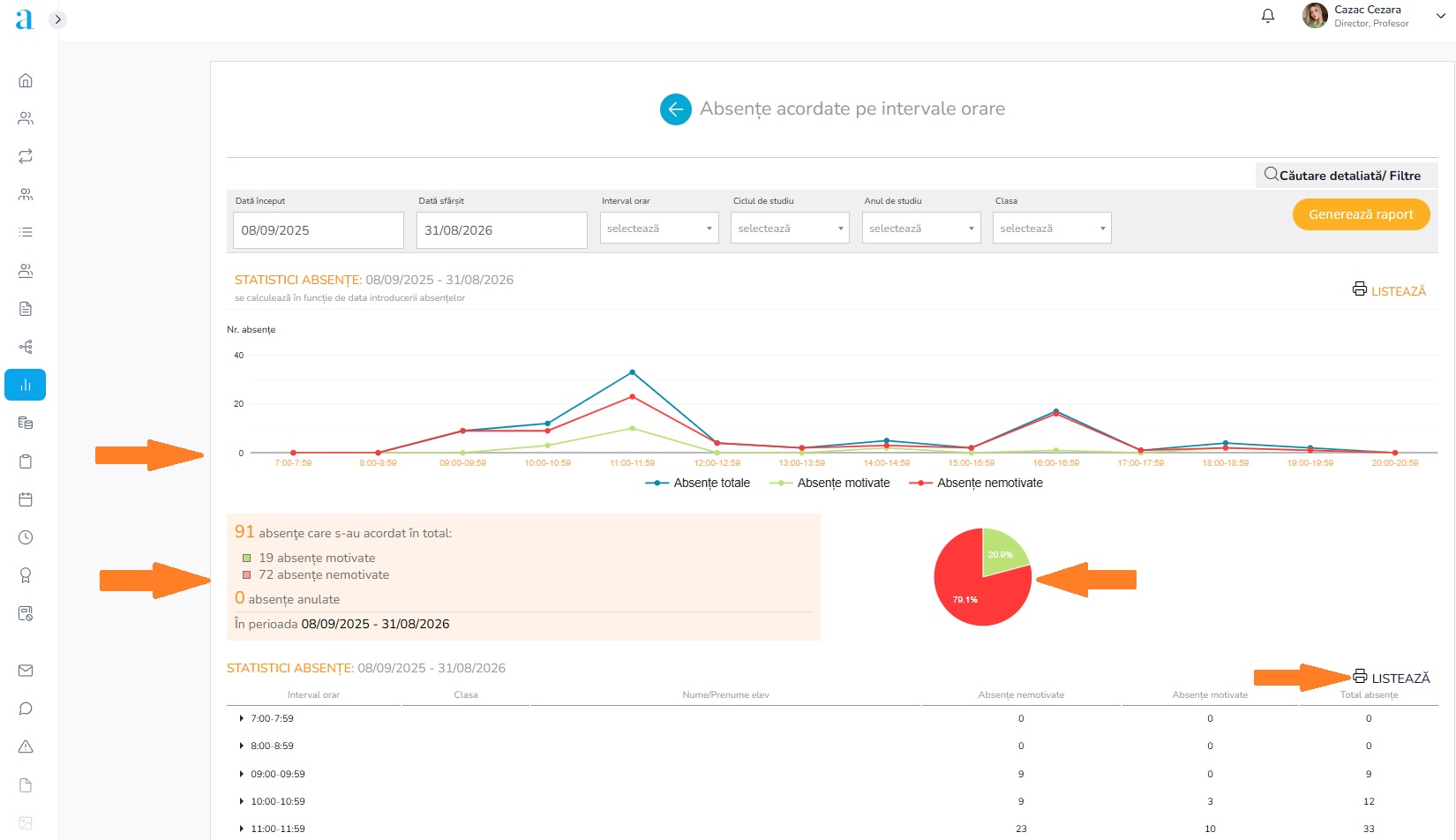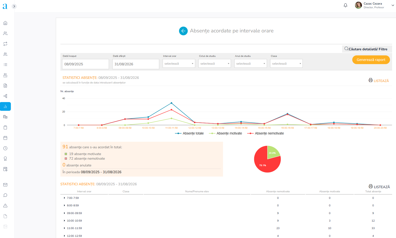 Important: Dacă unitatea de învățământ nu are încă intervalele orare stabilite, generarea statisticii se va realiza pentru intervalele de ore din cursul unei zile calendaristice (24 h).