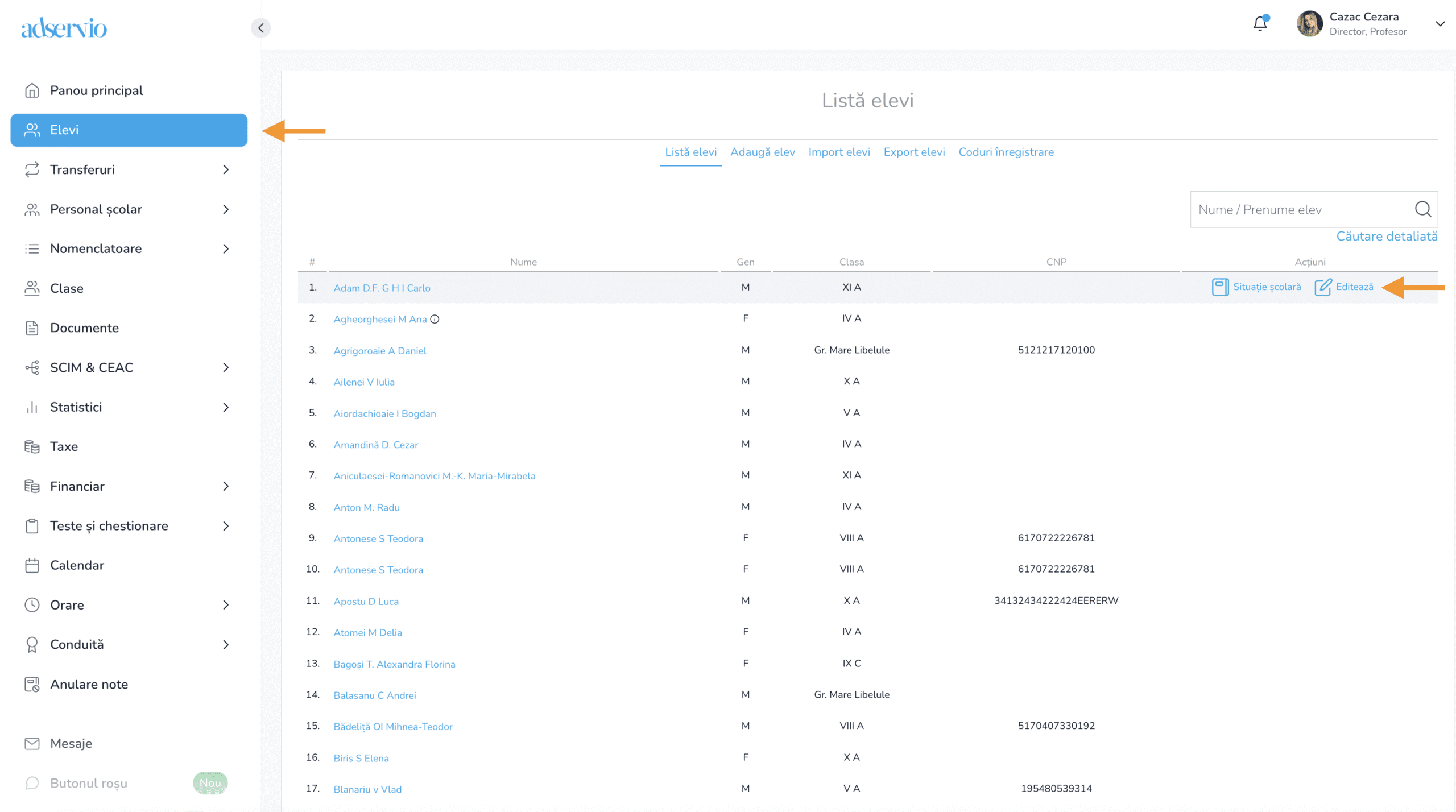 1. Accesați contul de manager,  modulul ”Elevi” și secțiunea ”Editează” din dreptul elevului.