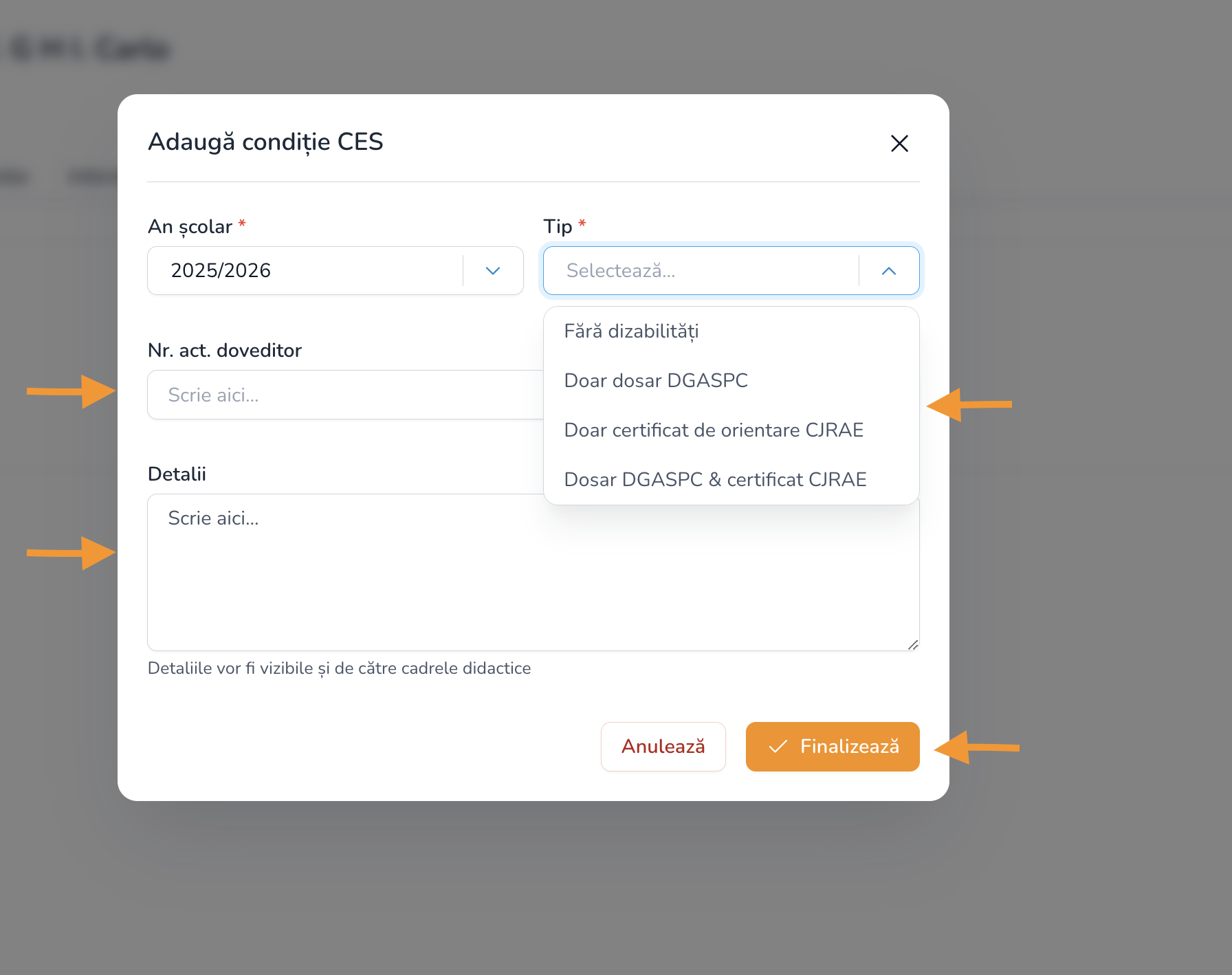3. Sunt necesare informații precum ”Tip dizabilitate, Nr. act doveditor, detalii suplimentare”. După completarea tuturor informațiilor, apăsați butonul ”Salvează”.