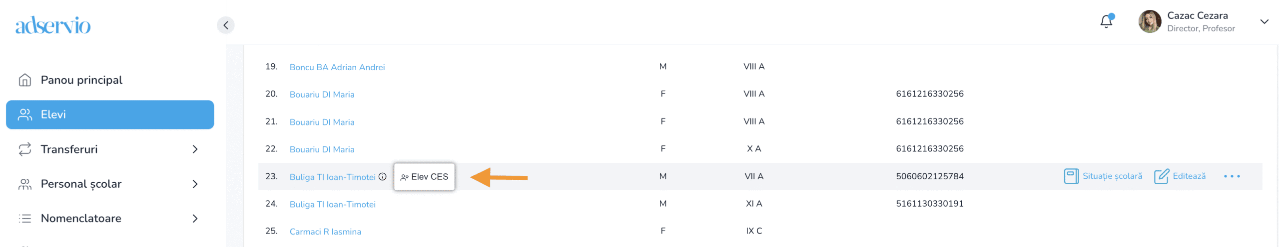 * În momentul în care se apasă click pe pictogramă, se afișează descrierea ”Elev CES”.
