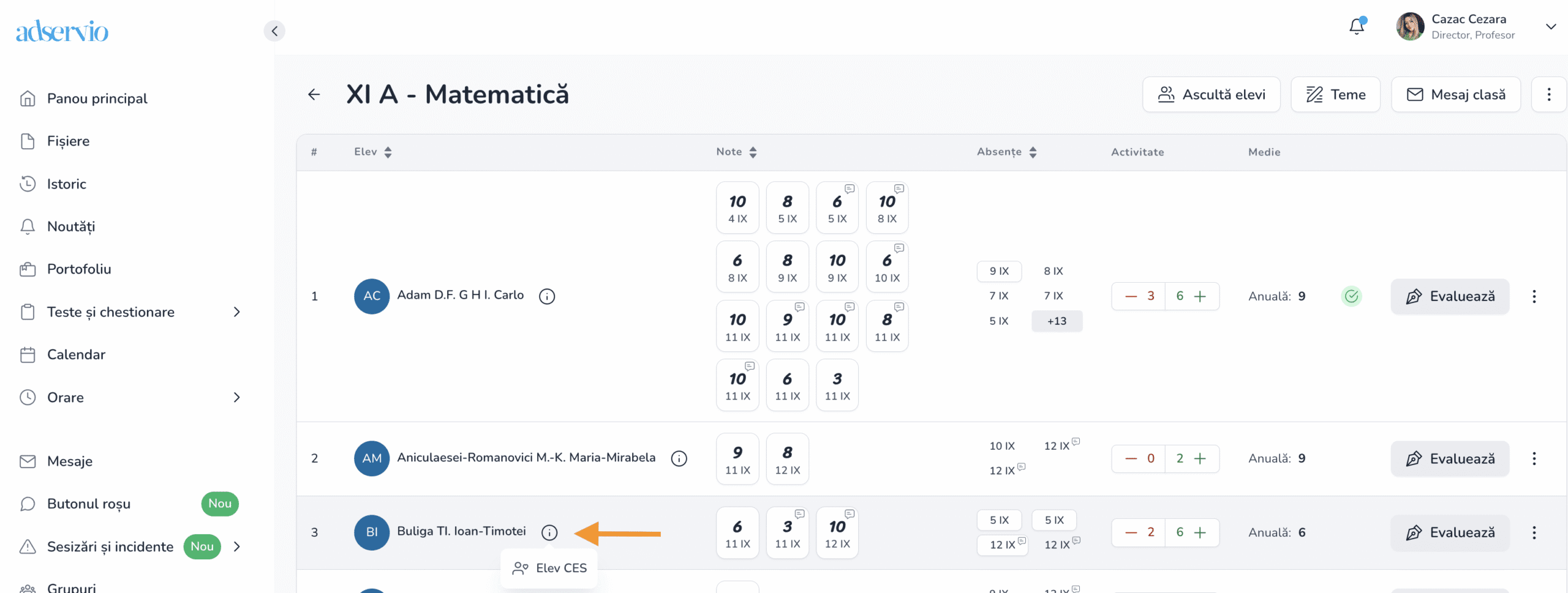 4. Elevul va fi marcat în lista elevilor din contul de manager și în contul profesorilor cu o pictogramă sugestivă.