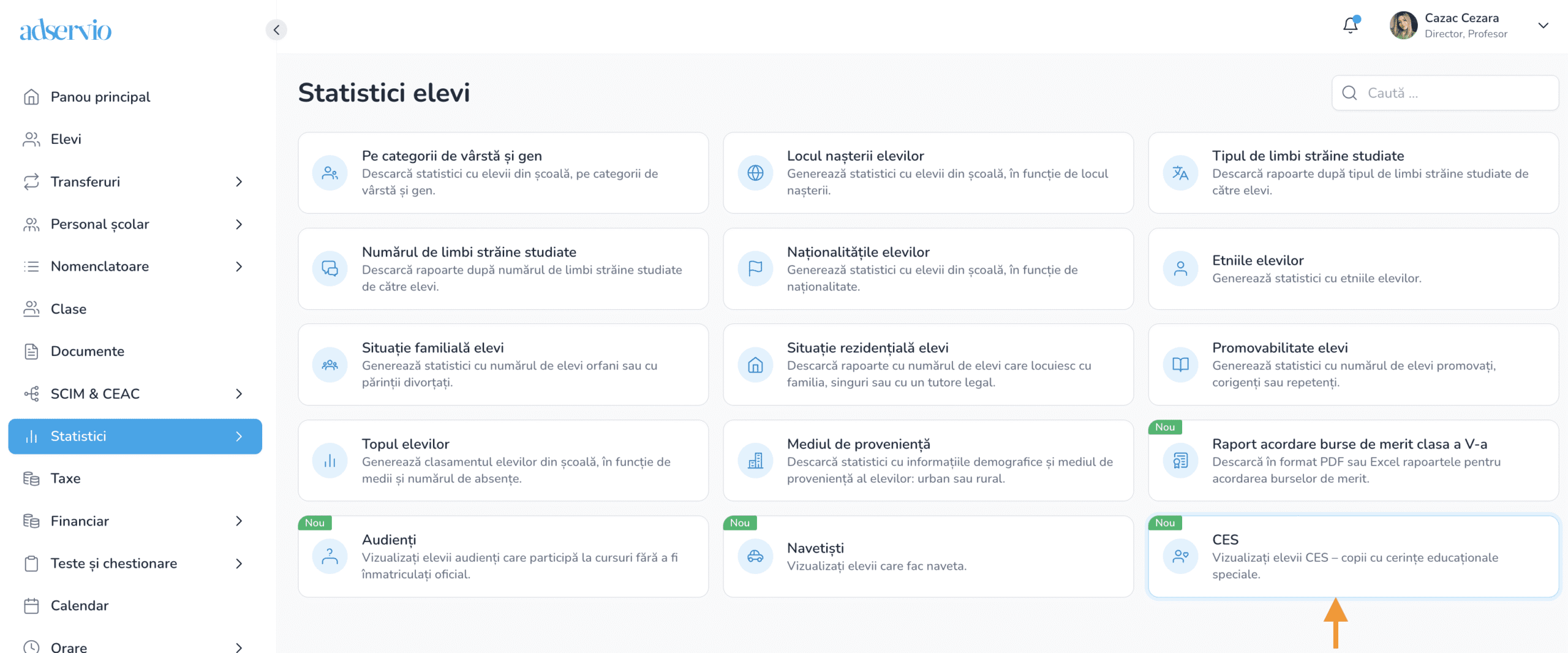 6. Accesați secțiunea ”CES” și vizualizați raportul elevilor marcați cu statusul ”elev CES ”.
