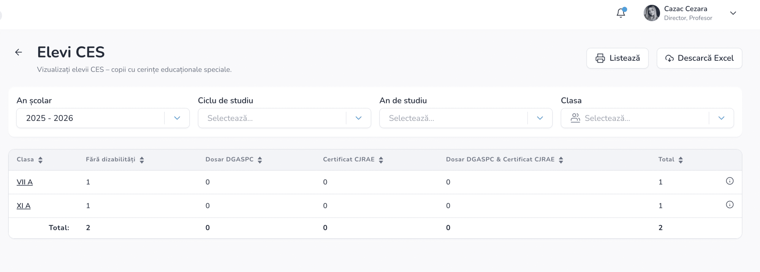 **Raportul este general pentru întreaga unitate școlară, în cazul în care doriți să vizualizați nominal elevii marcați CES, accesați fiecare clasă, iar elevii vor și afișați în ordinea alfabetică.