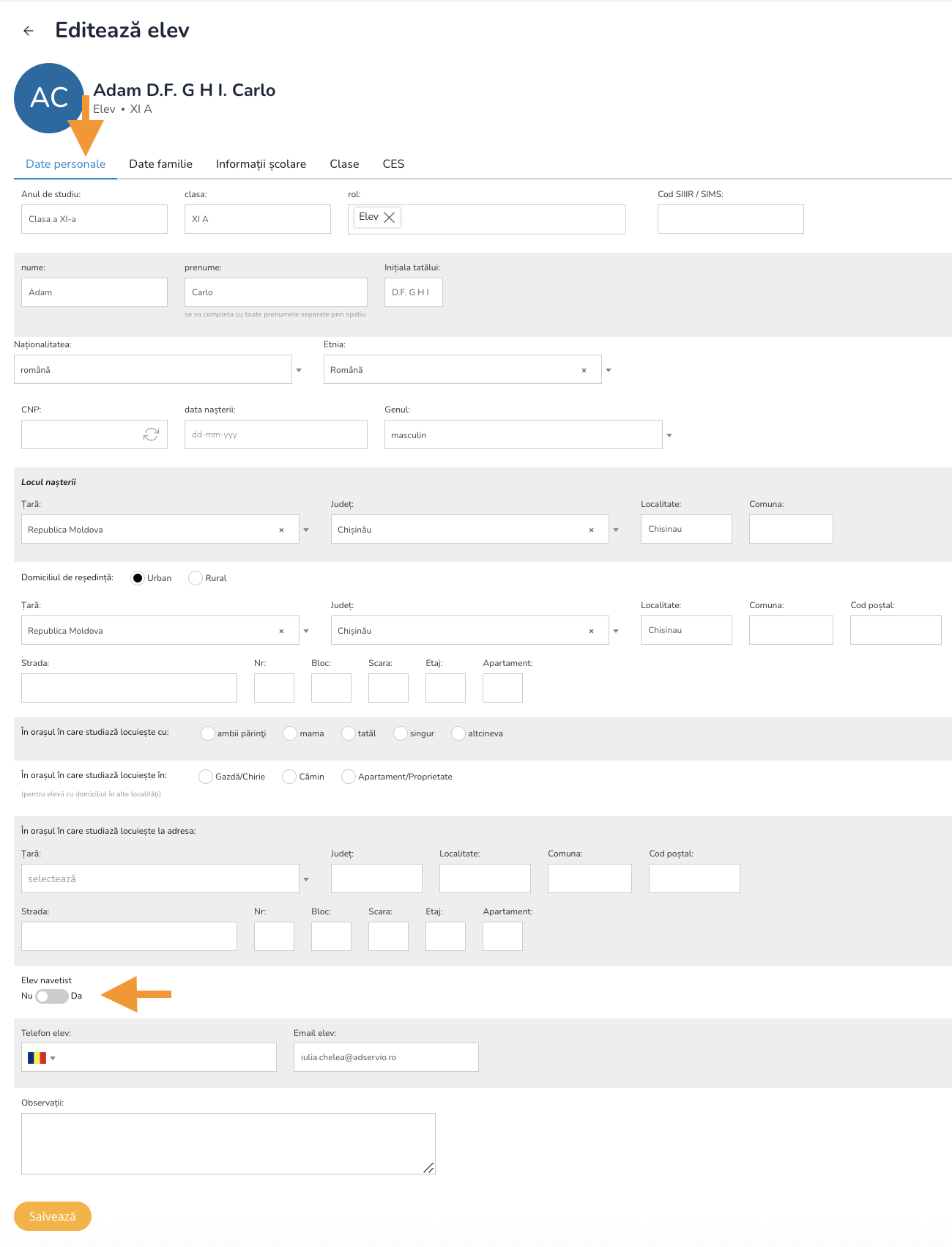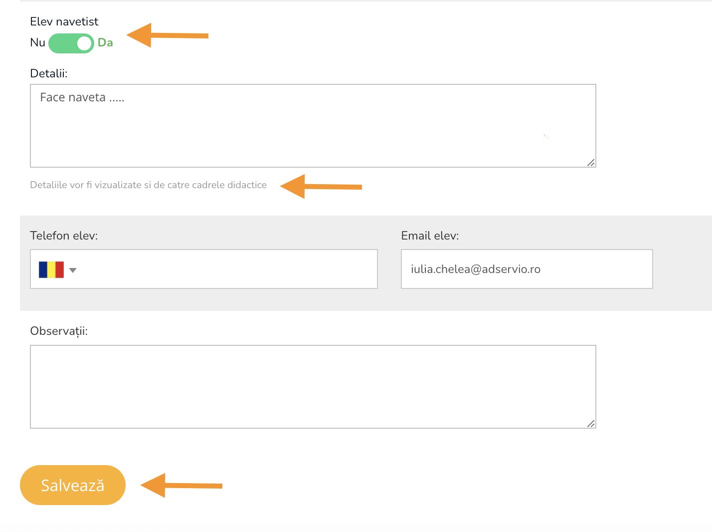 3. Activați rubrica ”Elev navetist”, completați informațiile despre elevul navetist și salvați modificarea, apăsând pe butonul ”Salvează”.