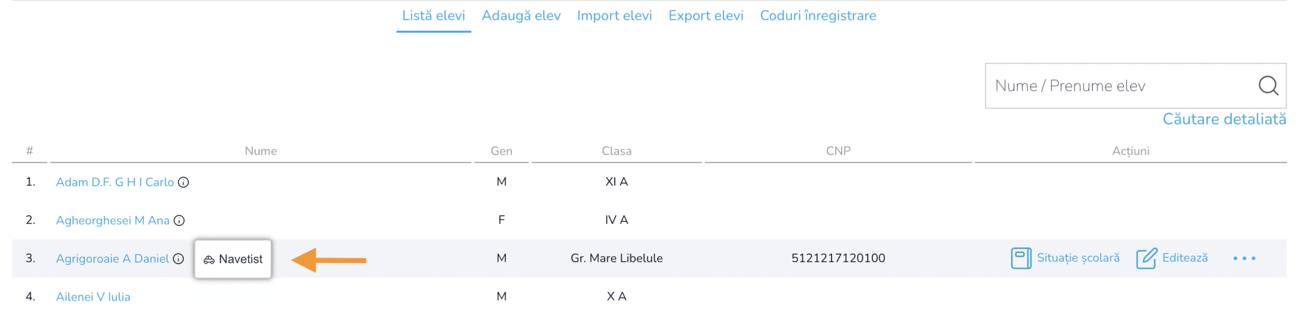 6. Accesați secțiunea ”Navetiști” și vizualizați raportul elevilor marcați cu statusul ”elev navetist ”.