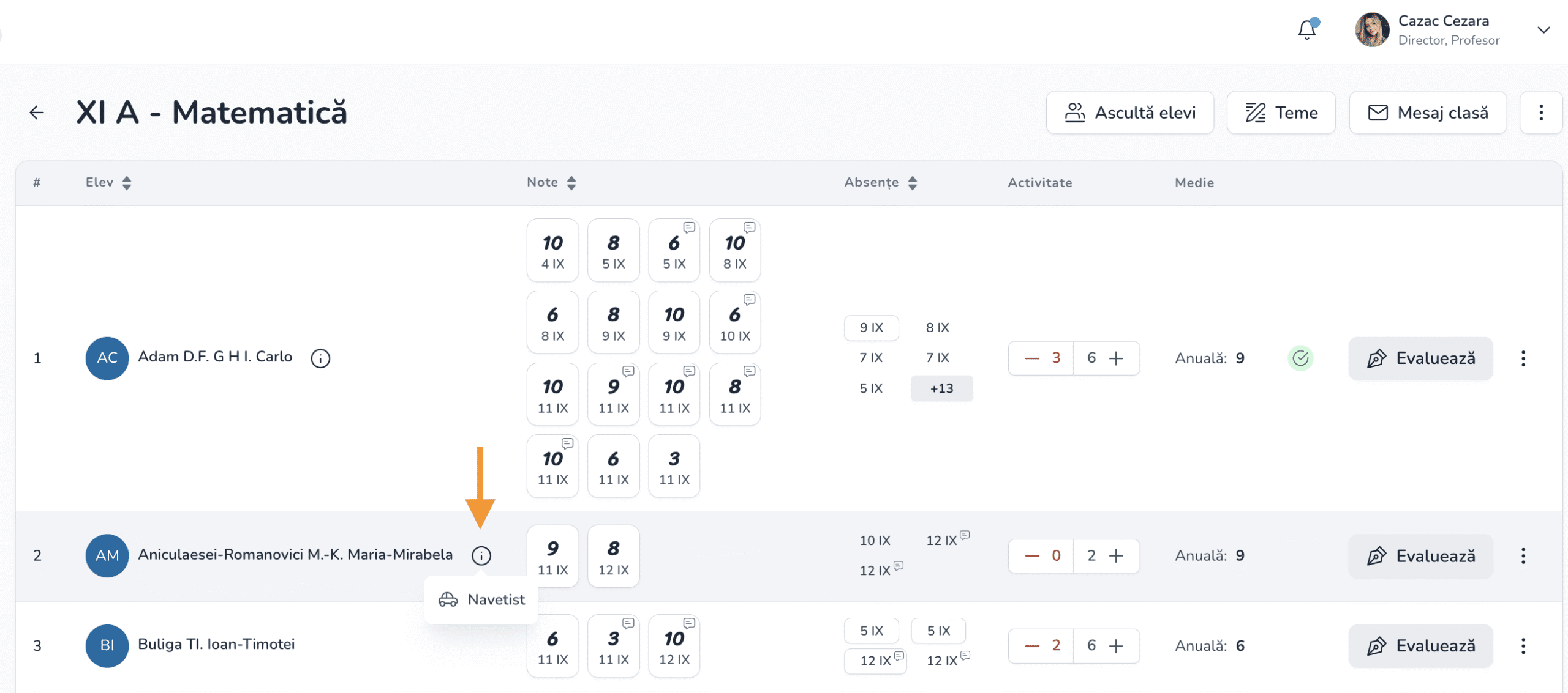 4. Elevul va fi marcat în lista elevilor din contul de manager și în contul profesorilor cu o pictogramă sugestivă.
