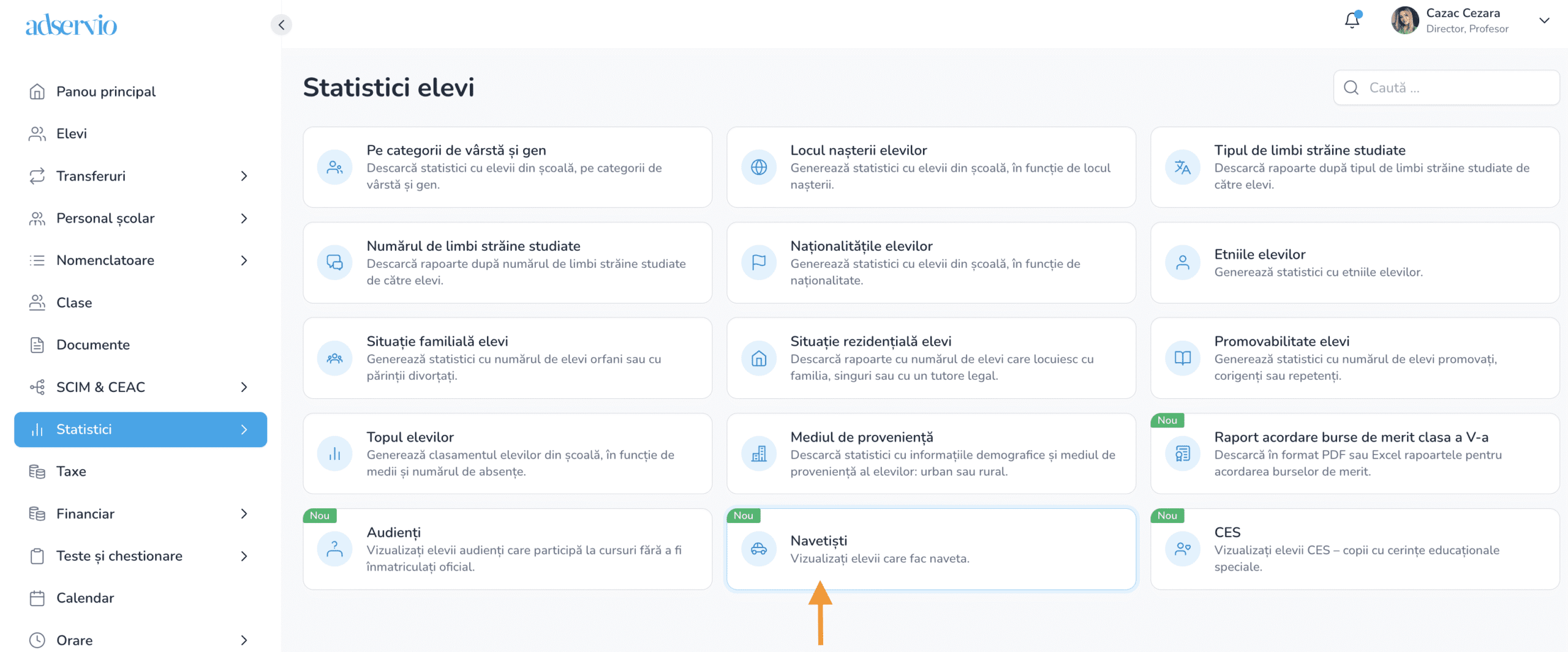 5. Pentru vizualizarea raportului elevilor navetiști, accesați modulul ”Statistici” – ”Elevi”.