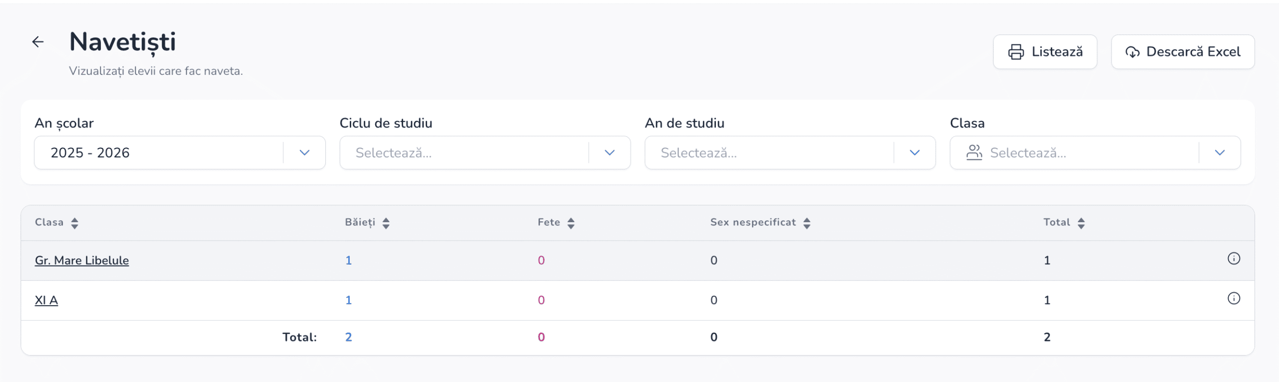 **Raportul este general pentru întreaga unitate școlară, în cazul în care doriți să vizualizați nominal elevii navetiști, accesați fiecare clasă, iar elevii vor și afișați în ordinea alfabetică.
