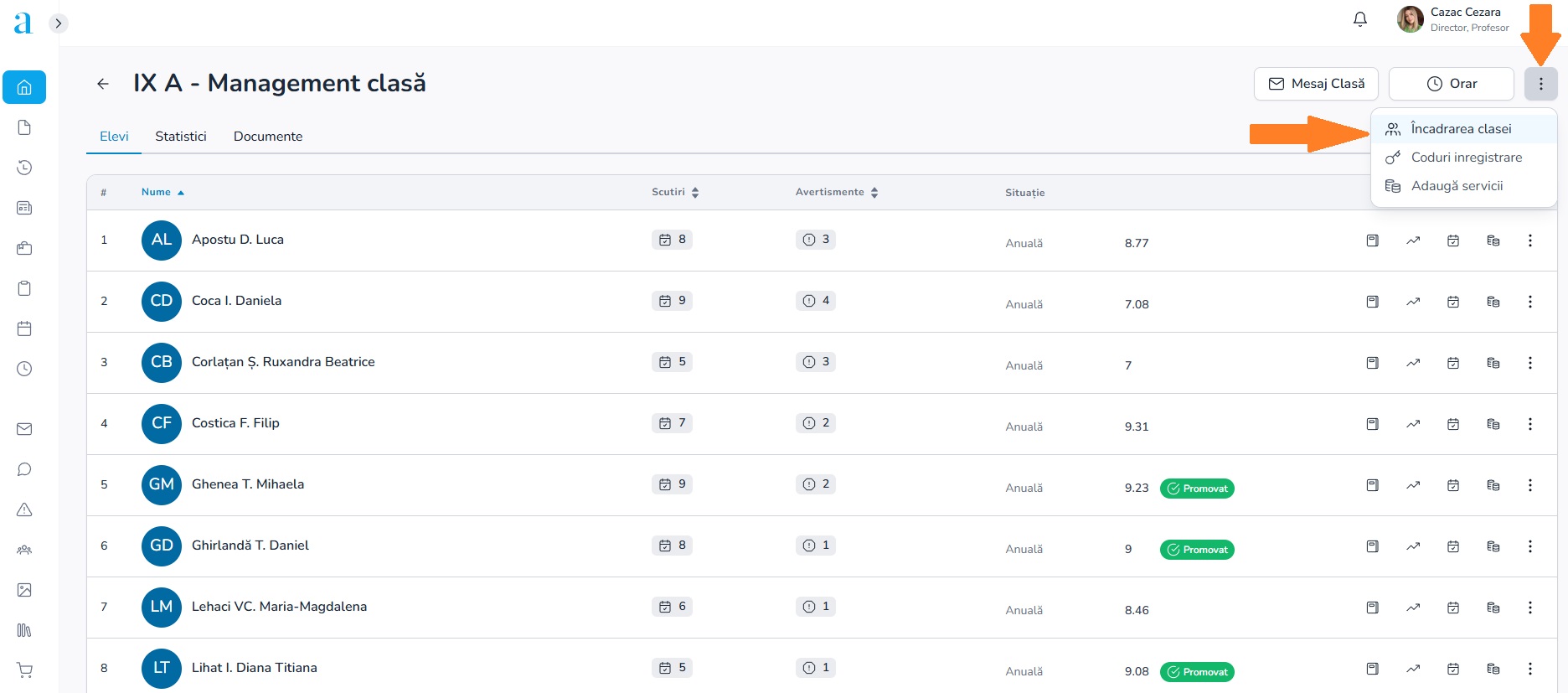 1. Din meniul principal Clasele mele alege clasa de dirigenție (Management clasă);
