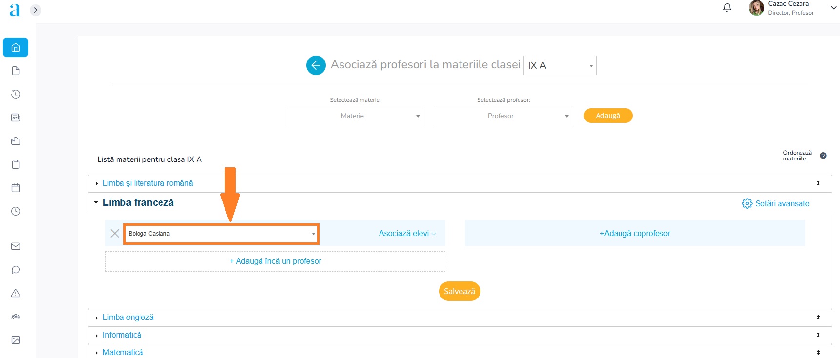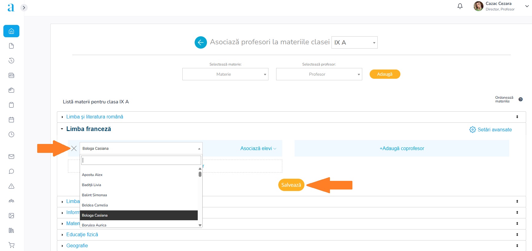 3. Alege materia dorită și apasă „X” în dreptul numelui profesorului, iar ulterior pe butonul Salvează;