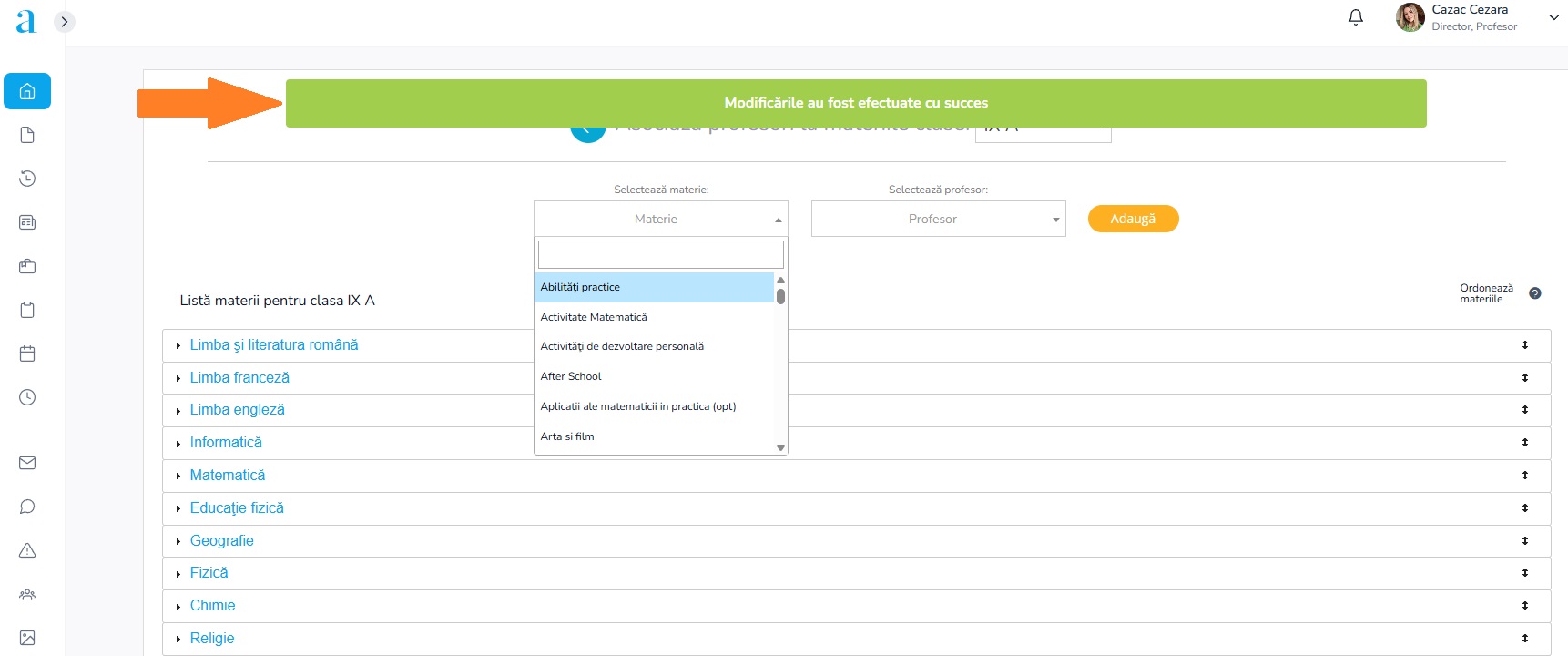 6. În acest moment vei regăsi, asociat materiei, numele corect al profesorului.