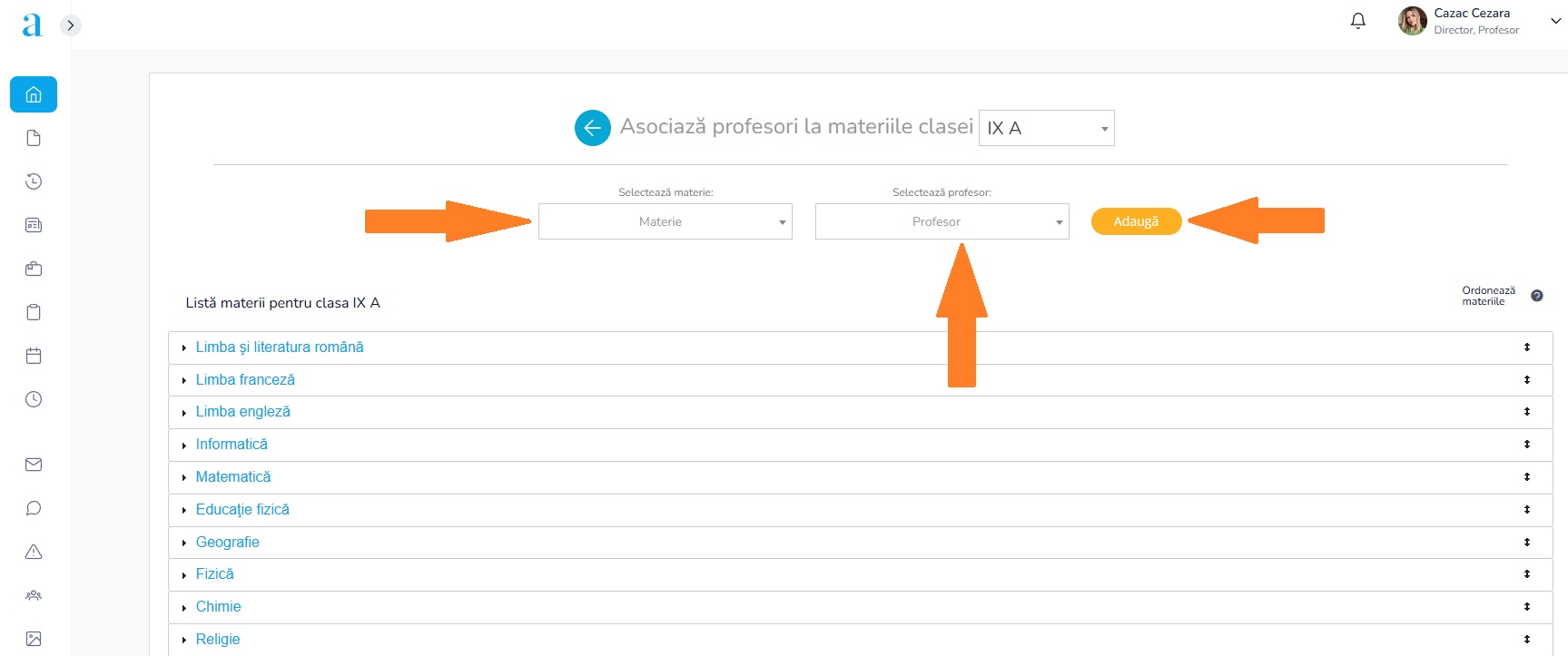 4. Selectați o Materie și un Profesor, iar ulerior apasă butonul Adaugă;