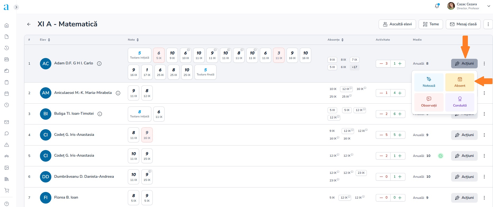 2. Alege din listă elevul pentru care trebuie motivat absentul și selectează butonul Acțiuni, iar apoi Absent.