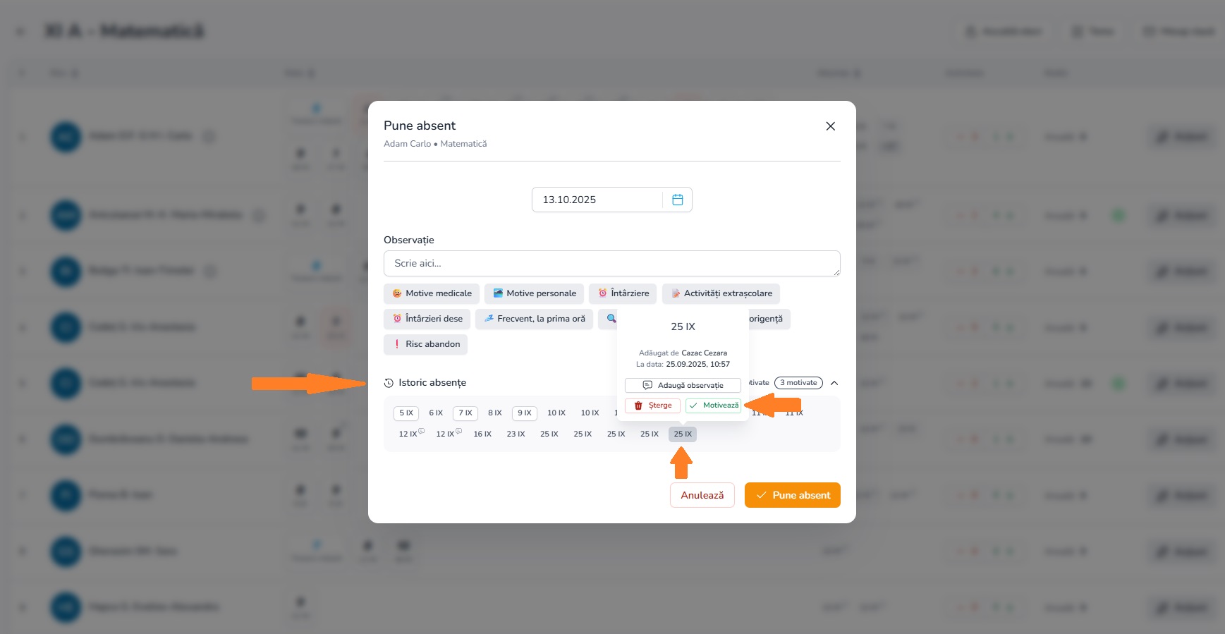3. Identifică în partea de jos a ferestrei Istoricul absențelor și apasă pe absența pe care dorești să o motivezi, iar apoi apasă Motivează. Opțional poți atribui o observație motivării.