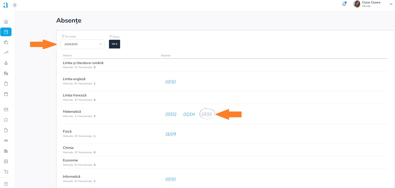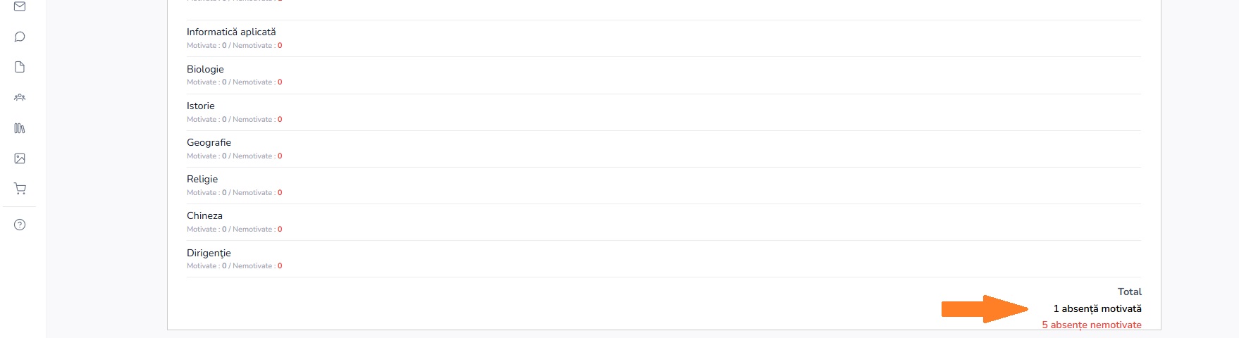 - numărul absenţelor motivate şi al celor nemotivate este afişat în partea de jos a paginii;