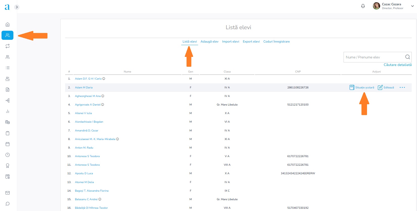 1. Selectează modulul Elevi, alege secțiunea Listă elevi, apasă butonul Situație școlară;