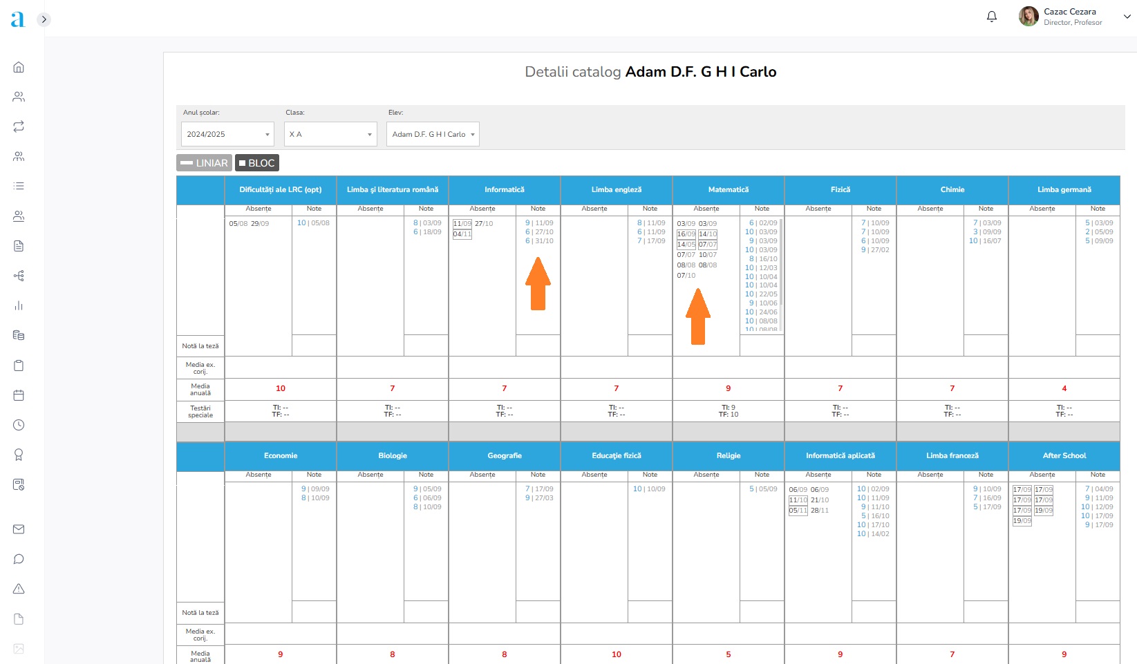 3. Apăsând pe coloana de absenţe sau note prezentă în dreptul fiecarei materii, poți vizualiza în detaliu informaţii cu privire la notele şi absenţele primite de elevul selectat.
