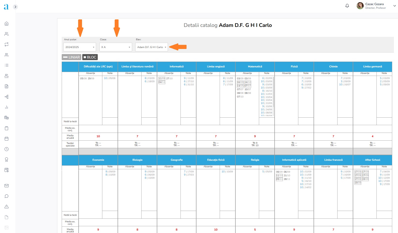 - ai posibilitatea să schimbi anul şcolar şi clasa pentru care dorești să vizualizezi situaţia şcolară;